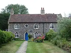 The almshouses were built in the late 18th or early 19th centuries and rebuilt in 1832 by Thorne. Originally with a red brick front, they now have a Gothic facade of flint. A plaque marks the founding of the almshouses in 1678.[1]