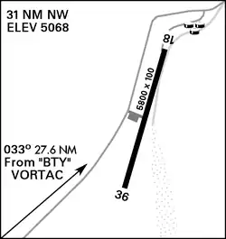 Pahute Mesa Airstrip covers an area of 35 acres (14 ha) which contains one asphalt paved runway designated 18/36 and measuring 5,800 by 100 feet (1,768 m × 30 m).[1] The runway had numbers with both ends, but it is now marked with "X" on either end.