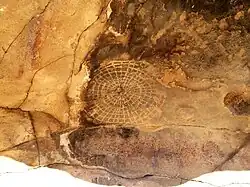 The interior of the rock alcove is adorned with many pictographs created by the Chumash, Salinan and Yokuts peoples over many thousands of years. In recent times there have been many marks left by early White settlers such as one reading "Geo. Lewis 1908", founder of Atascadero, California. Unfortunately there has also been major defacing of this site; in the 1920s the large pictogram was irreparably damaged by a shotgun blast.