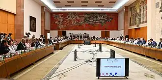 The first session of the Federal Executive Council in the new building was held at 29 April 1961. The Palace of the Federal Executive Council, later Palace of Serbia, received many foreign statesmen and delegations ever since.[6]