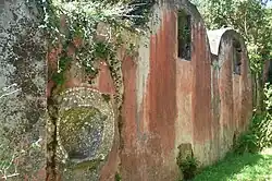The residence is a two-storey building, in a L plan with only its walls still standing, covered in ornate late-Baroque frame windows.[5] These walls are constructed of plastered stone masonry and painted in reddish pigment. To the rear of the main building is a more recent kitchen annex that runs parallel to the principal body that defines a servant's courtyard.[5] This space is delimited by a wall, and partially, by the two cisterns with vaulted ceilings.[5] In several locations, including on the eastern wall of the cistern and western wall of the building are decorated "fountains" plastered with shells.[5]