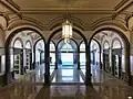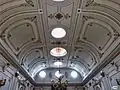 Inside, the monumental staircase and the lighting through large Skylights on the roof are remarkable. On the ground floor, there is a central hall on large pillars topped by a large skylight and a Stained glass window with the coat of arms of the province of Pontevedra. The plenary room is decorated with antique plasterwork. Innovative materials for the time are used in the interior of the building, such as iron in the Dormers and the mansard.[6]
