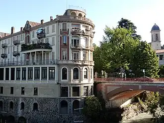 The main characteristic of the building, which features an Art Nouveau style,[2] is represented by the northern facade, which is cylindrical and overhangs the underlying Dora Baltea river, just downstream from the Ponte Nuovo.[1]