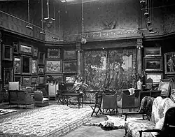 The mansion featured a three-story Italianate central hall under a glass dome.[8] Other rooms were finished in a variety of historic styles: a Louis XVI salon, an Indian room, an Ottoman parlor, a Renaissance library, a Spanish music room, an English dining room that could seat fifty, and a Moorish room, the rugs of which were impregnated with rare perfumes.[6][8] A collection of paintings, collected by Bertha Palmer, adorned the mansion's grand ballroom, 75-foot (22.9 m) long. The room's murals in the frieze above them were by Gabriel Ferrier.