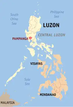 Pampanga's 2nd congressional district is one of the four congressional districts of the Philippines in the province of Pampanga. It has been represented in the House of Representatives of the Philippines since 1916 and earlier in the Philippine Assembly from 1907 to 1916.[3] The district consists of the western Pampanga municipalities of Floridablanca, Guagua, Lubao, Porac, Santa Rita and Sasmuan since 1987.[4][5] Until 1972, it encompassed the eastern Pampanga municipalities of Apalit, Arayat, Candaba, Mabalacat, Magalang, Mexico, Minalin, San Fernando, San Luis, San Simon, Santa Ana, and Santo Tomas.[6] It is currently represented in the 19th Congress by Gloria Macapagal-Arroyo of the Lakas–CMD (Lakas).[7]