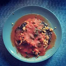 Pan de cazón (Spanish: "bread of small shark")[1] is a casserole dish in Mexican cuisine that is prepared in the style of lasagna using layered tortillas with shark meat such as dogfish shark, black beans or refried black beans and spiced tomato sauce with habanero.[1][2][3] It has been described as a specialty dish of the state of Campeche, Mexico.[4]