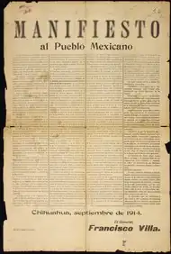 At the height of his power and popularity in late 1914 and early 1915, the U.S. considered recognizing Villa as Mexico's legitimate president.[7] In Mexico, Villa is generally regarded as a hero of the Mexican Revolution who dared to stand up to the United States. Some American media outlets describe Villa as a villain and a murderer.[8][9]