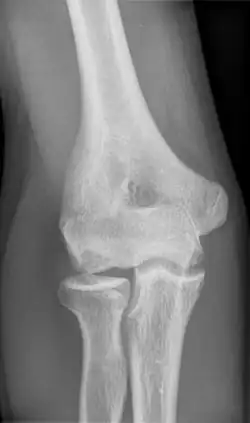 Panner disease is an osteochondrosis of the capitellum of the elbow.[1] Panner disease is primarily seen in boys between the ages of five and ten years old.[2] Panner disease is often caused by excessive throwing due to valgus stress. The disease causes pain and stiffness in the affected elbow and may limit extension; the affected elbow is usually on the dominant arm the child uses.[3] The disease may be associated with pitching and athletic activity. On radiographs, the capitellum may appear irregular with areas of radiolucency. Treatment is symptomatic, with a good prognosis. Treatment is minimal and includes restricting athletic activity to allow for the elbow to heal and for pain to be relieved.[4] The disease is named after the Danish radiologist Hans Jessen Panner (1871–1930).