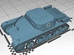 The Ausf F heavily armoured infantry assault tank (MG armed), a.k.a. PzKpfW I nA verstärkt or VK1801, was an up-armoured Pz I with the Schachtellaufwerk (inter-leaved track wheels) of the Ausf C, and a turret mounting two machine-guns. Thirty Ausf F tanks were built between April and December 1942, eight of which were sent to the Eastern Front for evaluation.[6]