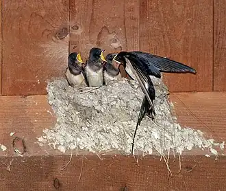 Birds are distinctive in the way they care for their young. 90% of bird species display biparental care, including 9% of species with alloparental care, or helpers at the nest.[9] Biparental care may have originated in the stem reptiles (archosaurs) that gave rise to the birds, before they developed flight.[55] In the remainder of bird species, female-only care is prevalent, and male-only care is rare.[9][23] Most birds, including passerines (perching birds), have their young born blind, naked and helpless (altricial), totally dependent for their survival on parental care. The young are typically raised in a nest; the parents catch food and regurgitate it for the young. Some birds such as pigeons create a "crop milk" which they similarly regurgitate.[56] David Lack developed a hypothesis that clutch size has evolved in response to the costs of parental care known as Lack's principle. It has since seen modifications but is still used as a general model.