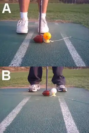 A: Ashi-donari stance, slightly behind the ball, used for getting loft on delicate chip shots. B: Kata-haba stance used for stability during long drives.
