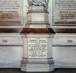 Modifications were made in 1922, removing the mullions from the flanking sections of the Victorian screen to insert six further panels, three on either side, to record the names of the sons of MPs and officers of the House of Commons killed in the war.[2] Columns separate the central section from the flanking sections, each topped by a gilt-bronze statuette: one representing the virtue of Faith and the other Fortitude. The extended memorial was unveiled by Edward, Prince of Wales (later Edward VIII) in 1922.[1]