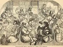 5. ^ Pike, Richard, ed. (1888). Railway Adventures and Anecdotes (Third ed.). Hamilton, Adams, and Co. pp. 143–144. 'We remember,' says a writer, 'once standing on the platform at Darlington when the Parliamentary train arrived. It was detained for a considerable time to allow a more favoured train to pass, and, on the remonstrance of several of the passengers at the unexpected detention, they were coolly informed, "Ye mun bide till yer betters gaw past, ye are only the nigger train."' 'If there is one part of my public life,' recently said Mr. Allport (Midland Railway) to the writer, 'in which I look back with more satisfaction than anything else, it is with reference to the boon we conferred on third-class passengers. But it took,' he added, 'five-and-twenty years' work to get it done.'