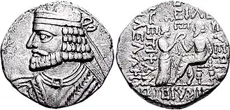 Parthian coinage was produced within the domains of the Parthian Empire (247 BC – 224 AD). The coins struck by the Parthians were mainly made of silver,[3] with the main currencies being the drachm and tetradrachm.[4] The tetradrachm, which generally weighed around 16 g, was only minted in Seleucia, first conquered by the Parthians in 141 BC.[5] Design-wise, Parthian coinage was based on Seleucid and Achaemenid satrapal coinage.[6]