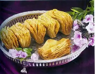 | Main ingredients | Laminated dough/phyllo, margarine, or argan or olive oil, or cooking oil, ground beef, kosher salt, onions, garlic, turmeric, nutmeg, spices |