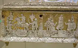 The subjects were typically classical, drawn from both mythology and Ancient Roman history (especially the early period covered by Livy), but biblical ones are also found. Compositions can often be shown to be borrowed from another medium, such as prints or bronze plaquettes,[11] and sections from the same mould can be found repeated, and used on more than one piece. The Victoria and Albert Museum has an armorial casket which is the only example that can be fairly closely dated, using the career of its owner, Cardinal Bernardo Clesio, as it must date to between his elevation as cardinal in 1530 and his resignation as Prince-bishop of Trent in 1538.[12] De Winter catalogued 115 white lead pastiglia caskets, only ten of which were over 20 cm high or deep. Another of this relatively large type was sold at auction in 2010.[13] Despite usually having locks, their thin alderwood frame meant that the caskets were probably too fragile to be used for really valuable items like jewellery, and they are thought to have been used for a variety of small objects including cosmetics and collections of seals, coins and the like.