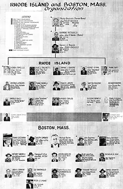 On March 26, 1990, Patriarca, Jr. and twenty other family members and associates were indicted on charges of racketeering, extortion, narcotics, gambling and murder.[23] The indictments included underboss Bianco, consigliere Joseph Russo, and lieutenants Biagio DiGiacomo, Vincent Ferrara, Matthew Guglielmetti, Joseph A. Tiberi Sr, Dennis Lepore, Gaetano J. Milano, Jack Johns, John "Sonny" Castagna, Louis Fallia, Frank and Louis Pugliono, Frank Colontoni and Robert Carrozza.[24] The arrests were described as "the most sweeping attack ever launched on a single organized crime family." One of the most damaging pieces of evidence was a tape recording of a Mafia induction ceremony, at which thirteen mafiosi were present.[25] Because of this embarrassment, Patriarca was replaced as boss by Bianco, who maintained a very low profile. However, Bianco was sentenced to 11 years in prison in 1991, while eight other family members were convicted on Racketeer Influenced and Corrupt Organizations Act (RICO) charges. Bianco died in prison in November 1994.[26]