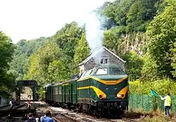 PFT have taken over the 21 km-long (13 mi) Ciney – Spontin – Yvoir railway line (also known as line 128) and operate it as the Chemin de fer du Bocq (CFB) heritage railway. It retains a connection to the national network at Ciney, which facilitates PFT using main line locomotives at their events. A gala is held every year around 15 August. During 2012 CrossRail AG provided a class 66 locomotive as a feature. In 2015, 16 kilometers (between Ciney and Evrehailles-Bauche) are operational. In 2016, the terminal section between Ciney and Braibant – which is parallel to the Bruxelles – Luxemburg main line then undergoing a track / overhead renewal – has been rebuilt. Connection with the national railway network at Ciney was suspended for two seasons. Modernization of the main line is continuing and Infrabel plans to free some unused space in Ciney in 2021–2023. This would allow the Chemin de fer du Bocq to have its own separate 2-tracks platform with a connexion to the Infrabel network. In 2019, rotten sleepers and 40 kg/m (81 lb/yd) rails were removed from the 2.6 km (1.6 mi) section between Evrehailles-Bauche and the Yvoir tunnel. COVID crisis and maintenance tasks with higher priority on the operated section and in Ciney have delayed the track reconstruction schedule that slowly restarted during the summer of 2021.