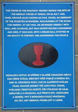 Bilingual memorial plaque in St Andrews with Hussite emblem