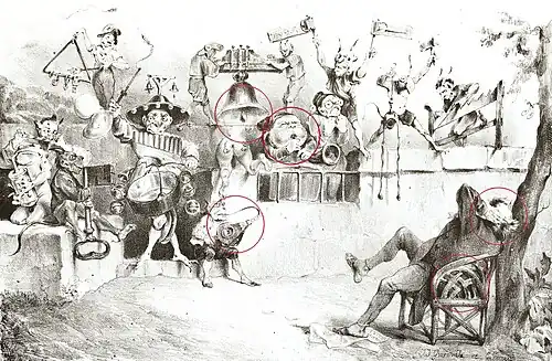 During the trial held in February 1832,[174] Daumier defended himself by claiming he had not intended to represent the king personally but symbolically depicted the government's bloated budget. He argued that the small figures gathered around the central character wore the same clothing, had the same silhouette, and shared the same physiognomy as him. Nonetheless, he was fined 500 francs and sentenced to six months in prison.[175][N 11]
