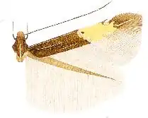Male, female. Forewing length 3.4 3.7 mm. Head: frons shining ochreous-grey with greenish and reddish reflections, vertex shining ochreous-brown with greenish and reddish reflections, neck tufts and collar shining bronze brown with reddish gloss; labial palpus first segment very short, white, second segment four-fifths of the length of third, dark brown with white longitudinal lines laterally and ventrally, third segment white, lined brown laterally; scape dorsally shining dark brown with a white anterior line, ventrally white, antenna shining dark brown, with a white line from base to two-thirds, in distal half more or less interrupted, followed towards apex by two white segments, ten dark brown and seven white segments at apex. Thorax and tegulae shining bronze brown with reddish gloss, thorax, including metathorax, with a white median line. Legs: femora of midleg and hindleg shining ochreous, foreleg brownish grey with a white line on tibia and tarsal segments, tibia of midleg brownish grey with white oblique basal and medial lines and a white apical ring, tarsal segments one, two and four with white apical rings, segment five entirely white, tibia of hindleg ochreous-brown with a white, very oblique line from base to beyond middle and a white apical ring, tarsal segment one with white basal and ochreous apical rings, segments two and three with ochreous apical rings, segments four and five entirely ochreous, spurs ochreous-grey. Forewing shining bronze brown, five narrow white lines in the basal area, a first subcostal, close to costa, from base to one-third, distally very slightly bending from costa, followed by a short second subcostal between the end of first and the transverse fascia, a medial starting just beyond base to just beyond the first subcostal, a subdorsal, starting just before the end of the medial to the end of the second subcostal, a dorsal from beyond base to one-third, a pale yellow transverse fascia beyond the middle, narrowed towards dorsum on the inside with a costal and dorsal prolongation towards apex and with an apical protrusion in the middle to beyond one half of the apical area, bordered at the inner edge by two tubercular pale golden metallic subcostal and dorsal spots, the subcostal spot with a patch of blackish scales on the outside, the dorsal spot further from base than the costal, at three-quarters of transverse fascia two tubercular pale golden metallic costal and dorsal spots, the costal spot lined brown on the inside, the dorsal spot twice as large and slightly more towards base than the costal, a white costal streak from the outer costal spot, a white apical line from the apical protrusion to apex, not in the cilia, cilia bronze brown around apex, paler towards dorsum. Hindwing shining brownish grey, cilia pale brown. Underside: forewing shining greyish brown, distally paler, the apical line visible, hindwing as forewing, but paler in dorsal half. Abdomen not examined, already used for dissection.[1]