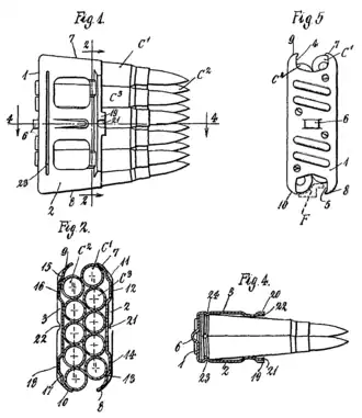 2. An asymmetrical spring steel clip of ten rounds in a double-staggered column would then be inserted, feed end up, into the magazine against the spring pressure of the magazine follower; when fully inserted the clip would be caught and held by a catch. (Note: this clip, like the clip used in the Austrian Model 95 rifle, could only be inserted one way and thus could potentially cause confusion under the stress of combat). Unloading the magazine would be done by (if necessary) retracting and holding open the breech mechanism, then pushing the trigger forward from its neutral position; the clip and any remaining cartridges would be ejected upward.