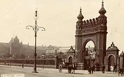 Following a great wave of public grief after Robert Peel's unexpected death in 1850, a commemorative statue was erected in the park, paid for by public subscription.[14] This was the beginning of a collection of bronze and marble statues of public figures to be erected in the park, all of which were produced by the sculptor Matthew Noble. The collection included depictions of Queen Victoria, Albert, Prince Consort, Joseph Brotherton MP,[15] and Richard Cobden MP.[16] The statue of Queen Victoria was erected in front of the Salford Museum and Art Gallery in 1857, to commemorate the royal visit of 1851 to Manchester and Salford, when she was welcomed by a crowd of eighty thousand people in the park. The statue was unveiled by the Queen on her second visit in 1857 by which time a stone arch decorated in the Indian style, the Victoria Arch (pictured), had been erected in her honour at the entrance to the park.[17] A commemorative statue of the Prince Consort was erected after his death in 1861.