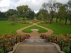 On 29 March 1845, the committee bought the 32 acres (13 ha) of the Lark Hill estate from William Garnett Esq for £5,000.[7] A design competition was held for the three parks - Queen's Park and Philips Park, in Manchester, and Peel Park in Salford. Each park was required to have playgrounds, including provision for archery and quoits, together with skittle and ball alleys, a refreshment room, one or more fountains, and retiring places. The competition was won by Joshua Major and Son of Knowsthorpe, near Leeds, and the parks were laid out under that firm's supervision in 1845–46, by the company of Pim and Richardson, Nurserymen, of Higher Ardwick.[5]