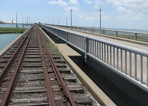 The island end of Galveston's Pelican Island Causeway taken from an abandoned railroad bridge running beside the causeway