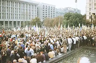 The People's Movement of Ukraine (Ukrainian: Народний Рух України, romanizedNarodnyi Rukh Ukrayiny) is a Ukrainian political party and one of the first opposition parties in Soviet Ukraine.[14] It is often simply referred to as the Movement (Ukrainian: Рух, romanizedRukh). The party under the name Rukh was an observer member of the European People's Party (EPP) until 2013. It is considered to have played a key role in Ukraine regaining its independence in 1991.[15][16][17]