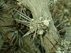 Species of Clade A always lack two key features of the stem present in most of the remaining "caulocacti": like most non-cacti, their stems begin to form bark early in the plant's life, and they also lack stomata – structures which control the admission of air into a plant and hence control photosynthesis. By contrast, species of Clade B typically delay forming bark and have stomata on their stems, thus giving the stem the potential to become a major organ for photosynthesis.[5][3] The subclades of Clade B, the Andean and SSA clades, also show consistent differences. The SSA clade is distinctly tree-like with pink flowers and leaves as well as spines on its areoles, which can grow out to form short, densely crowded branchlets or brachyblasts, which produce leaves. The Andean clade consists of climbers or undershrubs with smaller flowers and does not form brachyblasts.[3]