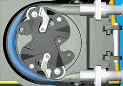 - Spring-loaded rollers - As the name indicates, the rollers in this pump are mounted on a spring. This design is more elaborate than the fixed occlusion, but helps overcome the variations in the tube wall thickness over a broader range. Regardless of the variations, the roller imparts the same amount of stress on the tubing that is proportional to the spring constant, making this a constant stress operation. The spring is selected to overcome not only the hoop strength of the tubing, but also the pressure of the pumped fluid.