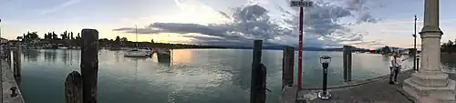 A panoramic photograph of the Marina of Peschiera del Garda during sunset, with the Lake and the Italian Alps visible.