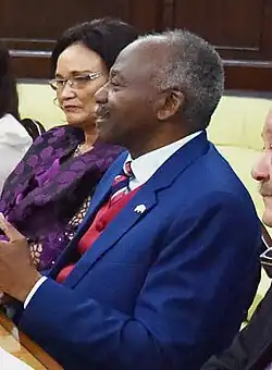 Following the November 2009 parliamentary election, President Hifikepunye Pohamba appointed Katjavivi to the National Assembly as one of the six non-voting members of parliament appointed by the President for the term that began in March 2010.[4] Subsequently, he was SWAPO's Chief Whip in the National Assembly. He was elected to the National Assembly in the November 2014 parliamentary election as a SWAPO candidate.[5] When the National Assembly began sitting for its new term on 20 March 2015, Katjavivi was sworn in as Speaker of Parliament, succeeding Theo-Ben Gurirab.[6][7] In 2016 he was appointed chancellor of the Namibia University of Science and Technology (NUST).[8]