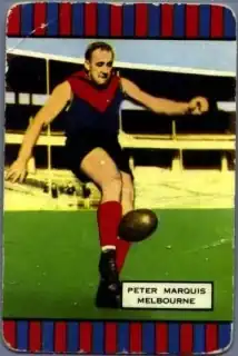 In 1953, Peter Marquis began his six-year auspicious career with Melbourne in the Victorian Football League (VFL), and played as a full back when the Demons overcame Collingwood in the close 1955 and 1956 Grand Final matches. He also collected premiership honours when his team beat Essendon in 1957.