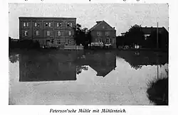 Franz Peterson rebuilt a modernized grain processing mill, fitted with a 51.5 kilowatts (69.1 hp) motor engine, a 25.8 kilowatts (34.6 hp) water turbine fed by a nearby 118 square feet (11.0 m2) pond. The mill daily produced 14 tons of grain. The facility operated till May 1951, when the State Grain department (Polish: Państwowe Zakłady Zbożowe) handed it to the local Peasant Cooperative in Bydgoszcz.[11]