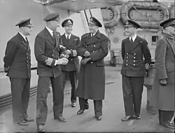 Rear Admiral I G Glennie, who relieved Rear Admiral R L Burnett in Command of Home Fleet destroyers, shown with officers of the Fleet Flagship, HMS KING GEORGE V, after calling in on the C-in-C Home Fleet. Left to right: Commander E F H C Rutherford, RN; Captain P J Mack, DSO, RN; Captain A E M B Cunningham-Grahm, RN; Rear Admiral I G Glennie; Captain F B Lloyd, OBE, RN.