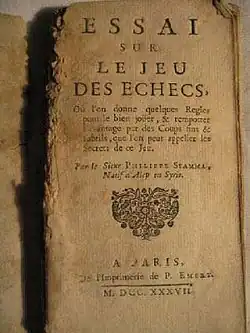 Philipp Stamma (c. 1705 – c. 1755), a native of Aleppo, Ottoman Syria, later resident of England and France, was a chess master and a pioneer of modern chess. His reputation rests largely on his authorship of the early chess book Essai sur le jeu des echecs published 1737 in France (English translation: The Noble Game Of Chess 1745). This book brought the Middle Eastern concept of the endgame to the attention of Europe and helped revive European interest in the study of the endgame.