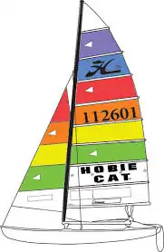 The 16 is the most popular Hobie Cat, both for recreational and racing purposes and as a one-design racer. The boat is 16'7" long, 7'11" wide, and has a mast 26'6" tall, but only weighs 320 pounds. As with the 14, it is intended to be sailed from the beach through the surf, and to be surfed back in on the waves to the beach. Instead of daggerboards or centreboards, the 16 has asymmetrical hulls which act like foils and keep the boat from crabbing, or slipping sideways from the force of the wind. Both jib and main sails are fully battened and total 218 square feet (20 m2). A trapeze is usually used by the crew and helmsman.
