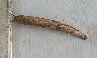 [10] The Carolina mantleslug uses love darts as a part of their mating behavior. A love dart (also known as gypsobelum) is a calcareous/chitinous dart that is hard, long, and sharp. Love darts are also found in sexually mature animals only, and are used as a part of the sequence of events during mating. They are used before the actual mating takes place. These darts are quite large in comparison to the animals.[11] Prior to copulation, the slugs will attempt to shoot darts into the other slug. There is no actual organ that receives the dart, however, this action is more similar to a stabbing motion. The dart also does not fly into the air to reach its target. It is fired as a contact shot. Then, the exchange of sperm happens and both of the slugs will separate to complete the mating ritual. The love darts have a harpoon-like shape which enables them to pierce through the skin.[12] The Carolina mantleslug is an egg-laying slug. They reproduce during the spring and late summer. They hibernate from early October until April in temperate regions. Sexual maturity is reached after one year and the species can live up to 4 years. The Carolina mantleslug lays 1-2 groups of about 70 eggs, depending on their diet. They have a hatching success of about 75% and this varies with the external temperature. Active dispersal in terms of colonization is extremely low due to the fact that the species stays confined to sheltered micro-habitats.[13]