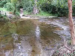 The Kbal Spean archaeological site, also known as "Valley of a thousand Lingas" (Khmer: លិង្គ១០០០), is located on the mountain, along the Kbal Spean River, which is a tributary of Siem Reap River. The site has many figures of Yoni and Linga as well as other figures carved into the rocks of the riverbed and banks which may become fully exposed in the dry season when the river dries up. The river is shallow and small waterfalls form at the site in the wet season. The site is accessible by trekking uphill through a 1.5 kilometres (0.93 mi) jungle track from the parking site.