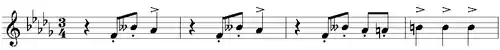 The first movement, Allegro ma non troppo e maestoso, makes extensive use of the three-note theme of F, Bdouble flat, and A, illustrated above.