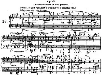 The Piano Sonata No. 28 in A major, Op. 101, by Ludwig van Beethoven was composed in 1816 and published in 1817. Dedicated to the pianist Baroness Dorothea Ertmann, née Graumen, it is considered the first of the composer's late piano sonatas.