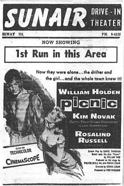 Picnic is a 1955 American Technicolor romantic comedy-drama film filmed in CinemaScope.[3][4] It was adapted for the screen by Daniel Taradash from William Inge's 1953 Pulitzer Prize-winning play of the same name.[5] Joshua Logan, director of the original Broadway stage production, directed the film version, which stars William Holden, Kim Novak, and Rosalind Russell, with Susan Strasberg and Cliff Robertson in supporting roles. Picnic was nominated for six Academy Awards, including Best Picture, and won two.