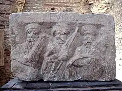 The Roman name for the monument is Nautae Parisiaci (the sailors of the Parisii, who were a tribe of Gauls).[2] It was found re-used in the 4th century city wall on the Île de la Cité and is now displayed in the frigidarium of the Thermes de Cluny.