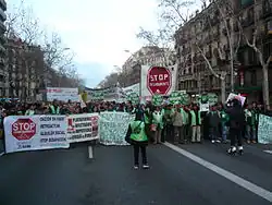 The Plataforma de Afectados por la Hipoteca (PAH, Platform for People Affected by Mortgages) was set up in Barcelona in February 2009, by activists previously involved in V de Vivienda (H for Housing). The group aimed to protest and combat the foreclosures which were evicting people from their homes. It is organised horizontally by assembly and grew exponentially across Spain, with 220 local groups recorded by 2017.[1] The group organises non-violent resistance to evictions and campaigns for a social rent and more aid for people unable to pay their mortgages. The PAH had successfully stopped more than 2,000 evictions by 2016.[1]