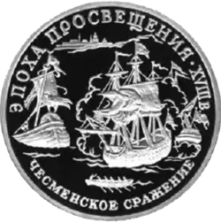 Reverse: three sailing ships and a boat at the Battle of Chesma, around: "Age of Enlightenment. 18th century.", bottom: "Battle of Chesma" Design: A.V. Baklanov Mint: Leningrad Mint (LMD). 240 indents on the rim.[3] |