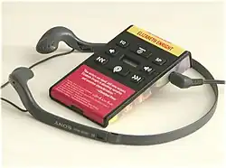 Playaway is a solid-state prerecorded audio player introduced in 2005 and redesigned in 2016. About the size of a deck of playing cards and weighing 2 ounces (57 g), it can store up to 80 hours of audio. As of March 2010, the audiobooks are all produced in high-definition audio.[4]