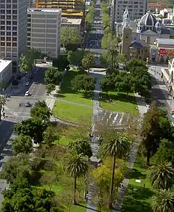 The present-day park was the site of California's capitol from 1849 to 1851, a period during which the California Republic gained American statehood; hence, the site contained California's first state capitol. From 1889 to 1958, San Jose's city hall occupied the center of the park before the local government moved it northward to North First and Mission Streets.[2] Today, San Jose City Hall is located nearby on Santa Clara Street.