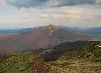 Połonina Caryńska, (Polish pronunciation: [pɔwɔˈnina t͡sarɨŋˈska]) also known as Połonina Berehowska, is a montane ecosystem in the Bieszczady Mountains laying between valleys of the Dwernik and Wołosaty rivers, which contain the settlements of Brzegi Górne and Ustrzyki Górne. It has four major culminations, the highest is Kruhly Wierch (1297 m), while the other ones have the heights of 1245, 1239 and 1148 metres.[1]